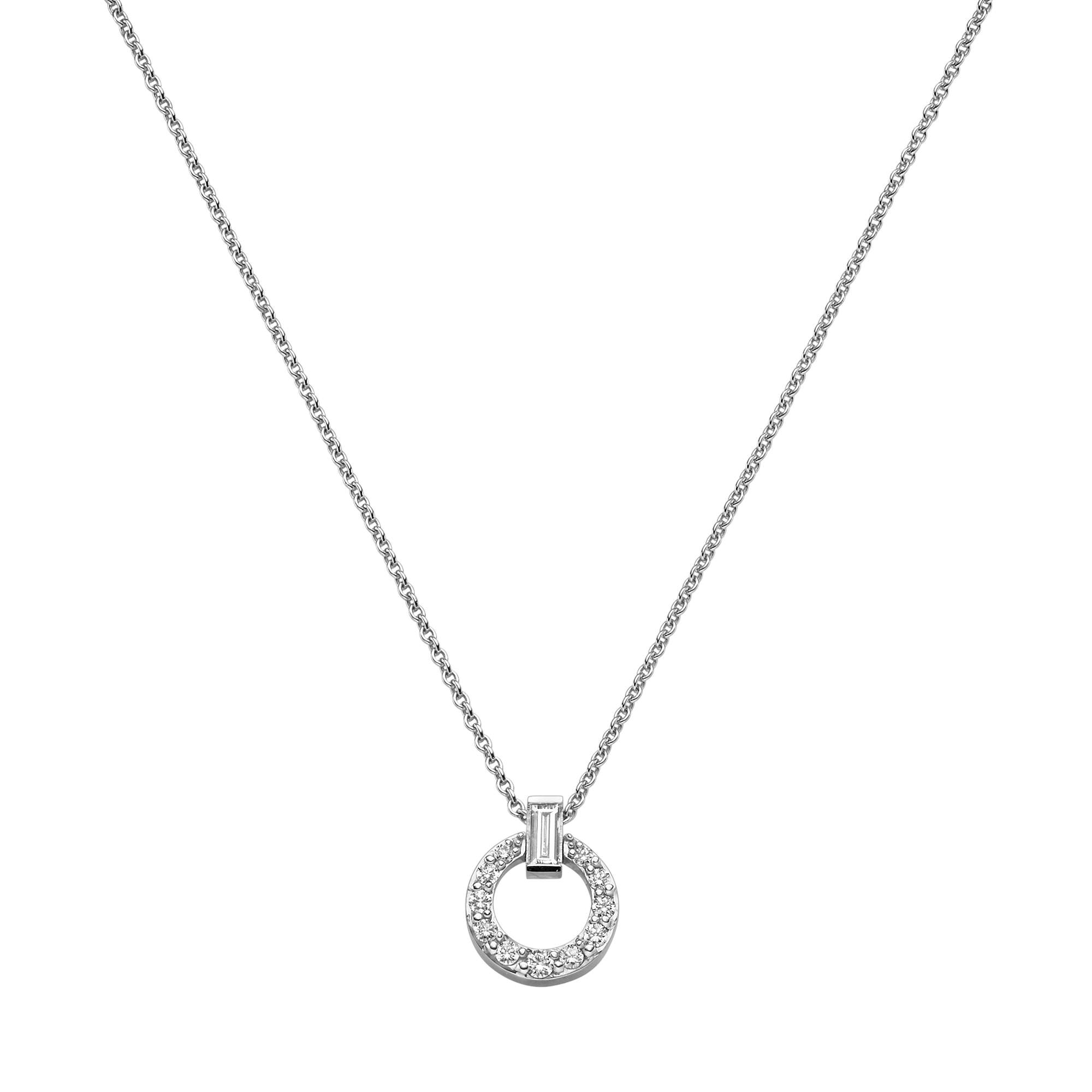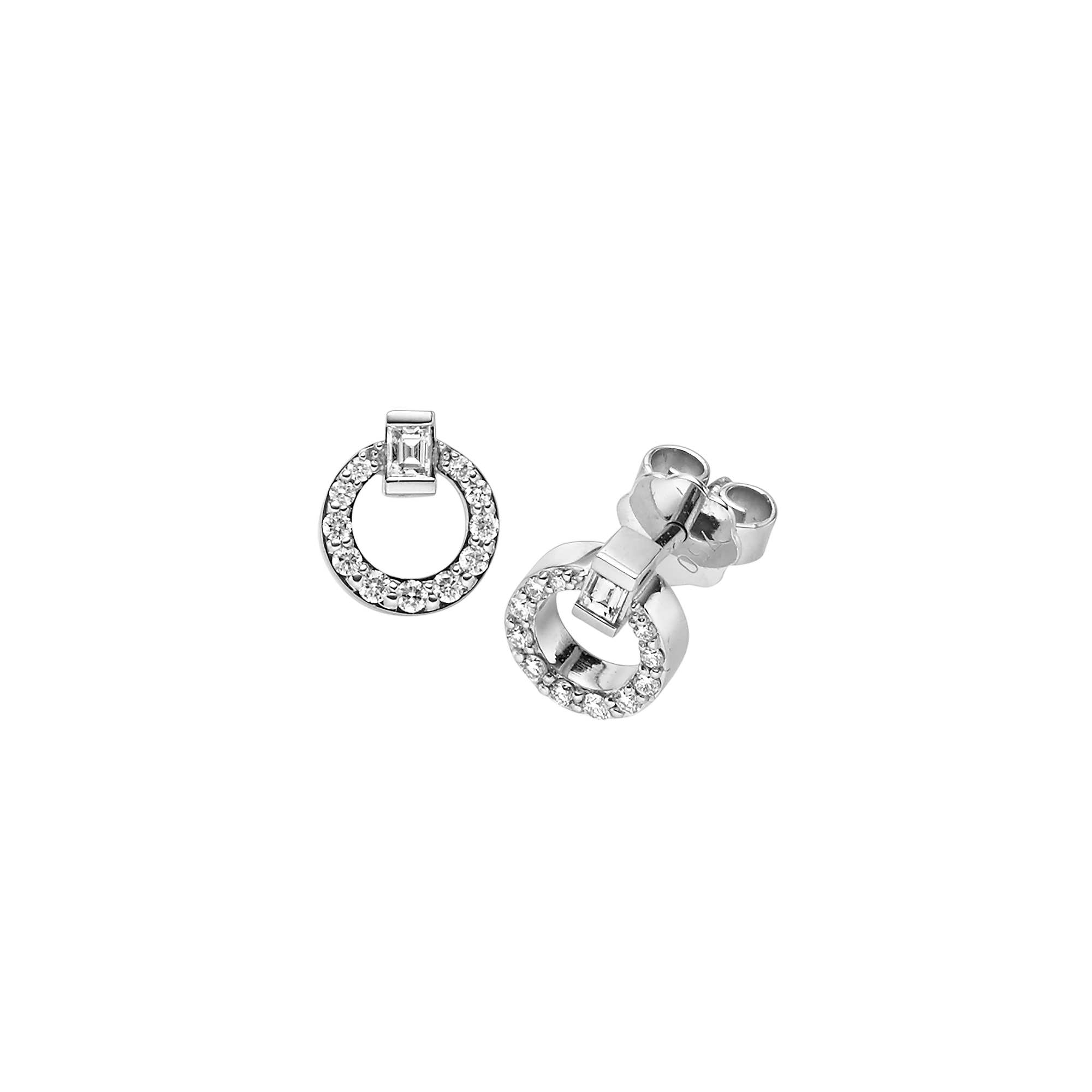 Dank des verwendeten Weißgolds und ihres klassisch-symmetrischen Designs verströmen die Ohrstecker, der Anhänger und der Ring – ebenfalls aus der Linie Panta rhei® – eine feine Eleganz. Der kreisförmig gesetzte Brilliantbesatz und die als Akzent verwendeten ausdrucksstarken Diamanten im exklusiven Baguette-Cut stehen dabei für modernen Luxus.