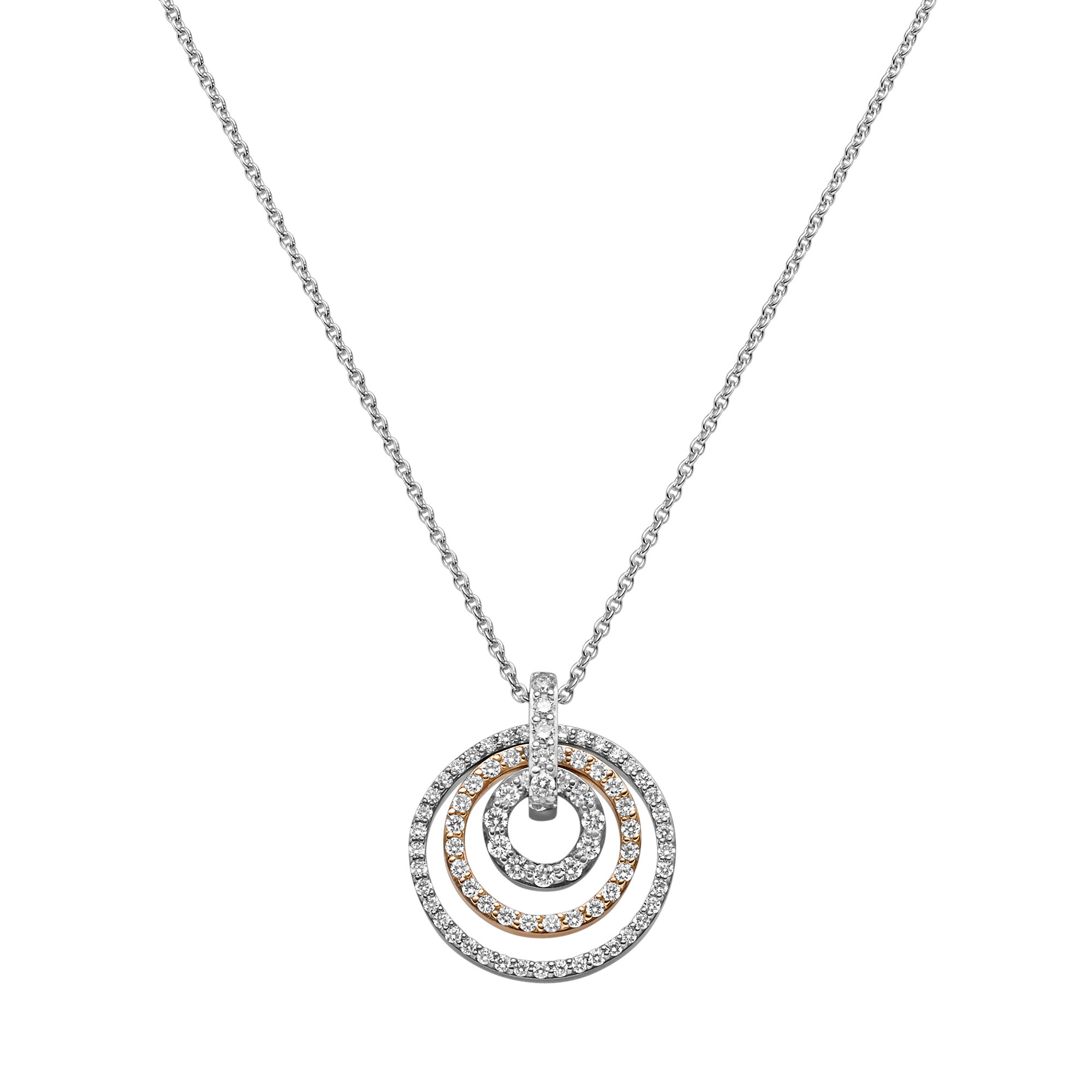 Begleiter in jeder Lebenslage: Anhänger folgen jeder unserer Bewegungen – kein Wunder, dass es sich bei ihnen um ganz besonders beliebte Schmuckstücke handelt. Dieses Collier aus der ikonischen Linie “Panta rhei®“ verströmt mit seinen drei diamantbesetzten Ringen und dem raffinierten Kontrast von Rosé- und Weißgold eine besonders feine Eleganz.