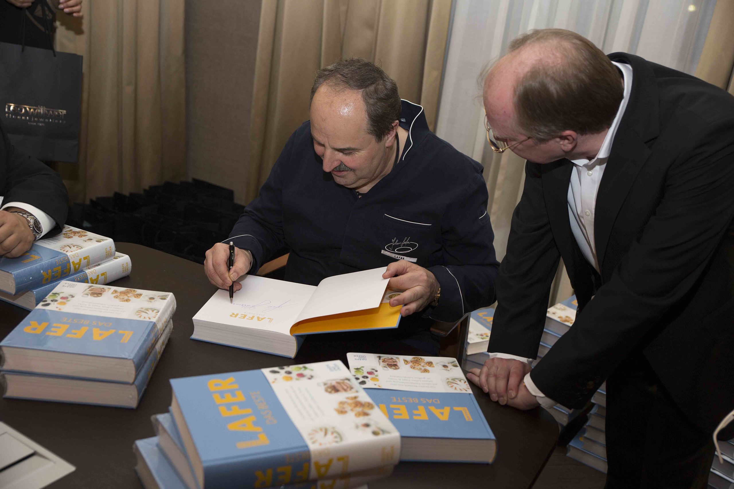 Johann Lafer, der mit anderen Sterneköchen die Gäste kulinarisch verwöhnte, kam zu einem Meet & Greet in unsere Lounge und signierte mit persönlicher Widmung sein neustes Kochbuch für unsere geladenen Gäste, welches jeder als Geschenk erhielt. Selfies mit ihm waren selbstverständlich und er nahm sich für jeden Zeit.